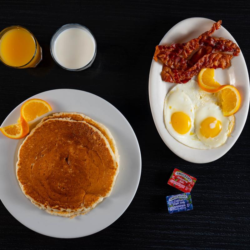 Two eggs and two pancakes or two pieces of French toast and either two pieces of bacon, two sausage links, or a sausage patty.