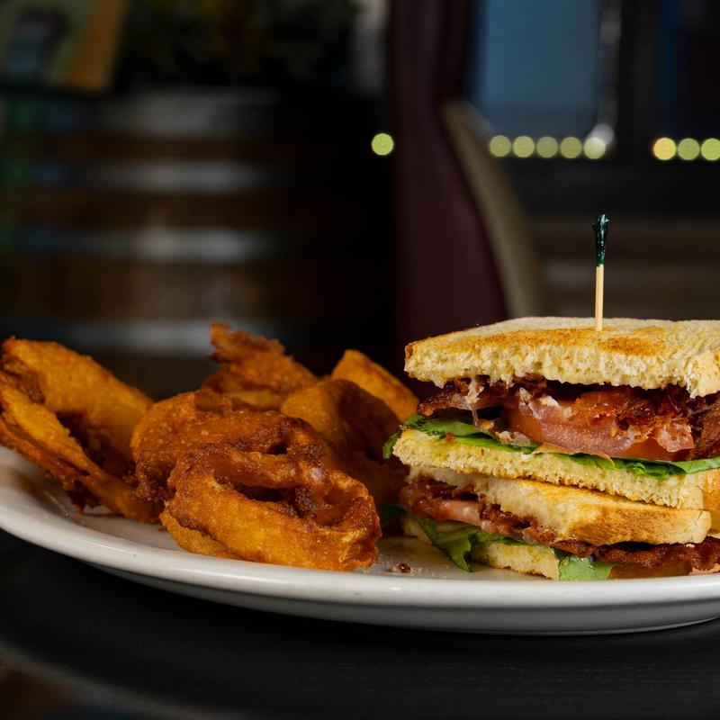 Classic triple-decker with bacon, lettuce, tomato, ham, turkey, Swiss, cheddar, and mayo on toasted sourdough.