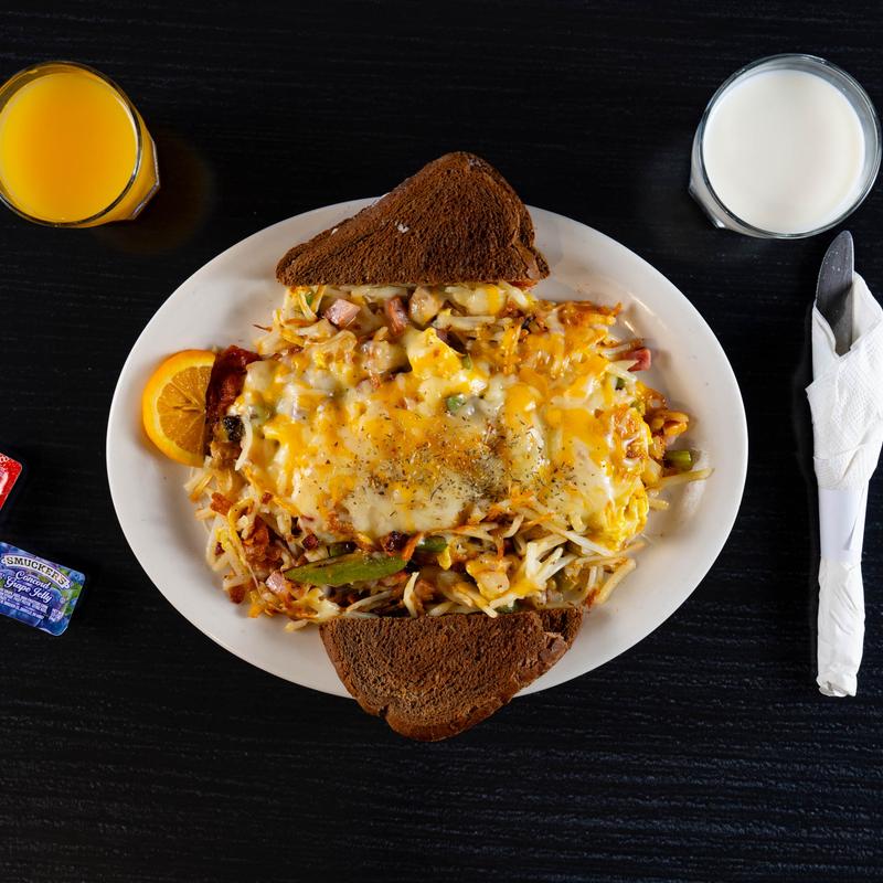Half order $11.99 | Full order $14.99 • Golden hash brown covered in egg scramble with sausage, bacon, ham, peppers, onion, and mixed cheeses. Have it topped with either country gravy or salsa & sour cream.