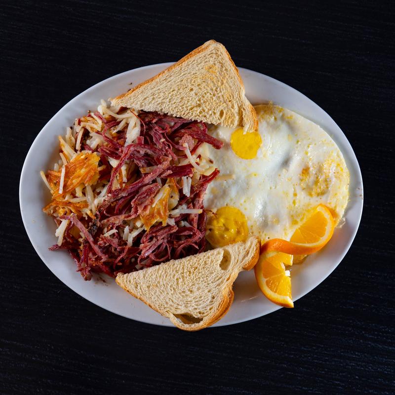 Corned beef served with three eggs | Served with hash browns or home fries and toast.