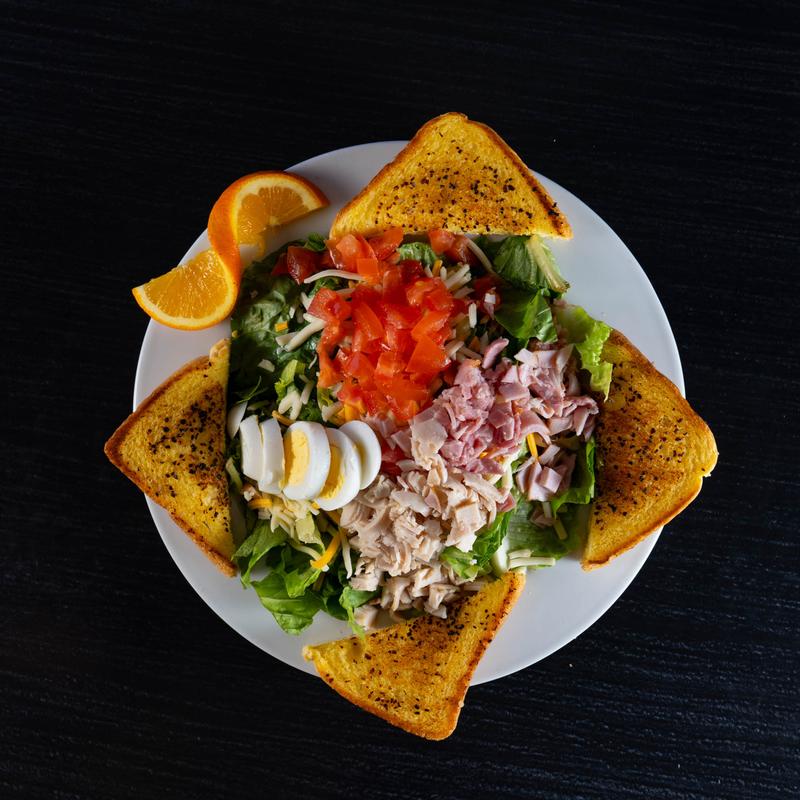 Turkey, ham, shredded cheese, diced tomatoes, and a hard-boiled egg | Choice of dressing.