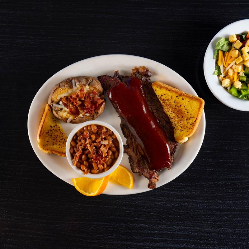All dinner entrées start with a soup or salad and come with a glazed buttery roll | Served with sautéed vegetables and choice of fries, mashed potatoes, grits, or baked potato.