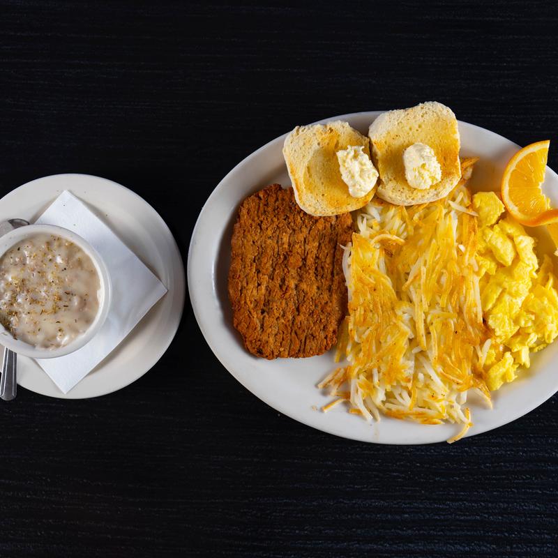 Three eggs and 5.5oz chicken fried steak smothered in sausage gravy | Served with hash browns or home fries.